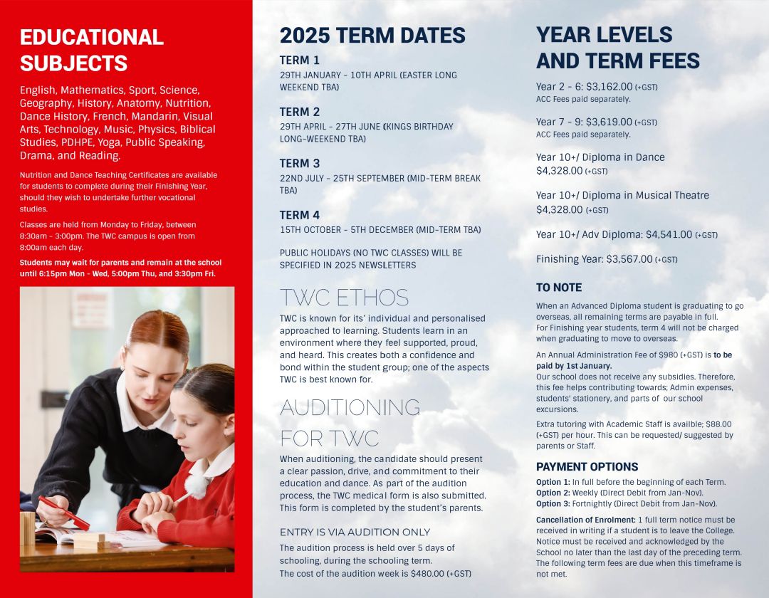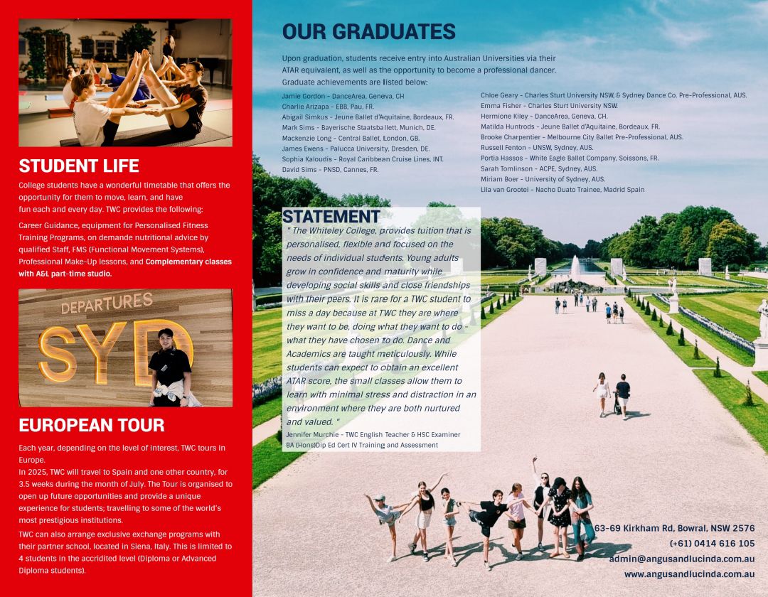 Un cursado intensivo en “The Whiteley College & AL danse” destinado a la formación integral de bailarines con proyección internacional. Con un plan de estudio amplio, los alumnos disfrutan de una variada gama de materias, desde disciplinas académicas tradicionales como matemáticas y literatura, hasta asignaturas innovadoras como ciencias ambientales y artes. Esta institución sobresale especialmente por su programa de artes escénicas, ofreciendo una formación en danza de alto nivel que prepara a los aspirantes a artistas para carreras en la industria de la danza.